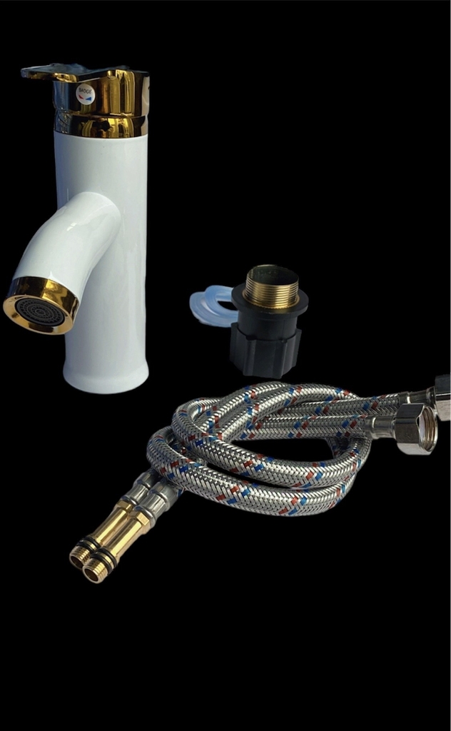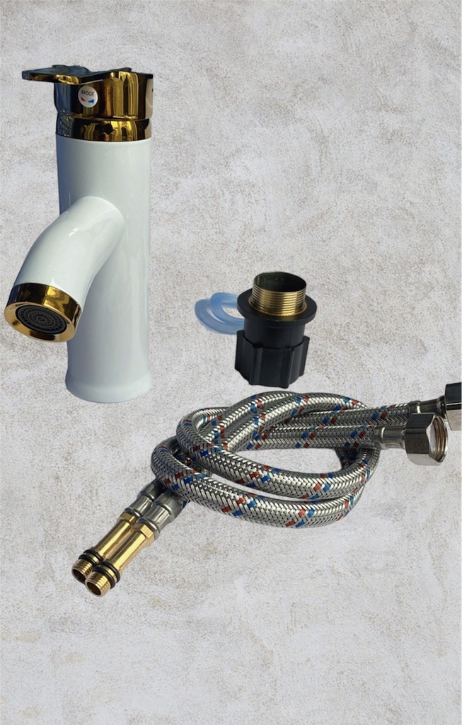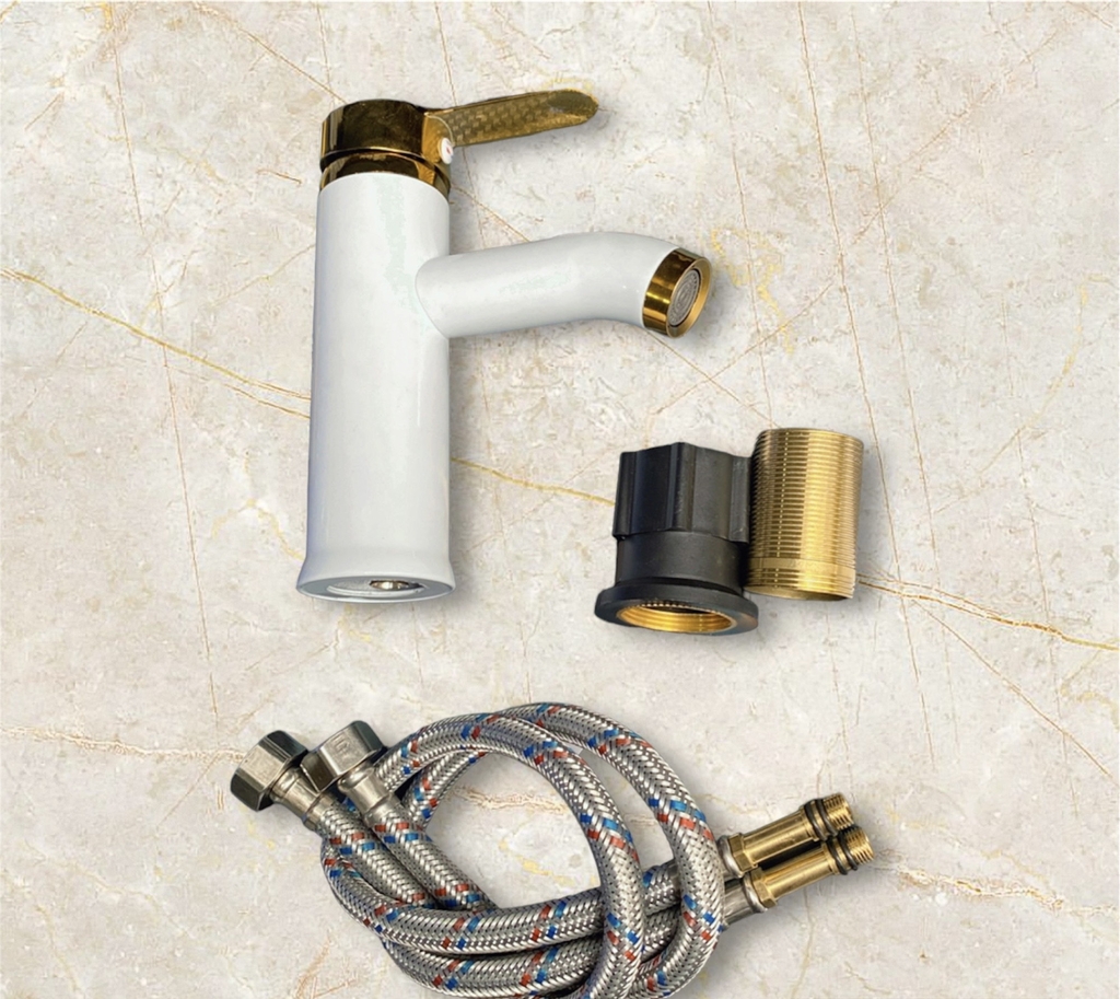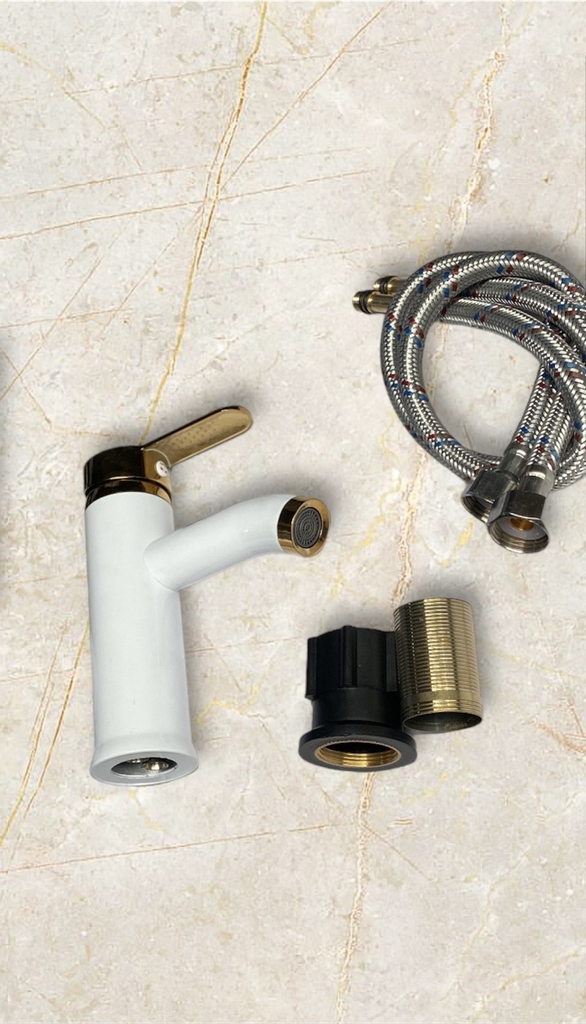 Vòi lavabo, vòi rửa mặt GIORMANI nóng lạnh vàng trắng cao cấp SNL51 kèm đôi dây cấp inox